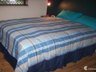 - Built-in robes, queen ensemble bed, bedside table, small desk